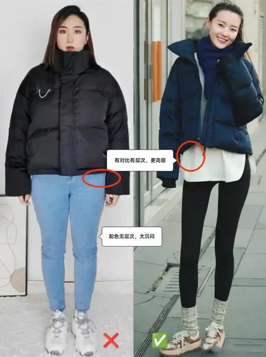 我们以前就有分享过穿衣打扮配色很关键,尽量不花哨,整体配色不要超过三个色调,这样可以降低出错率,上面的两位素人的穿搭对比超明显,白色羽绒服搭配上纯灰咖色的半身裙,简约大方。