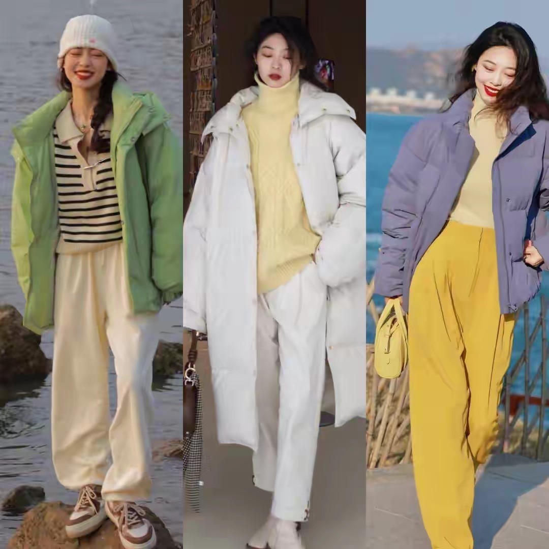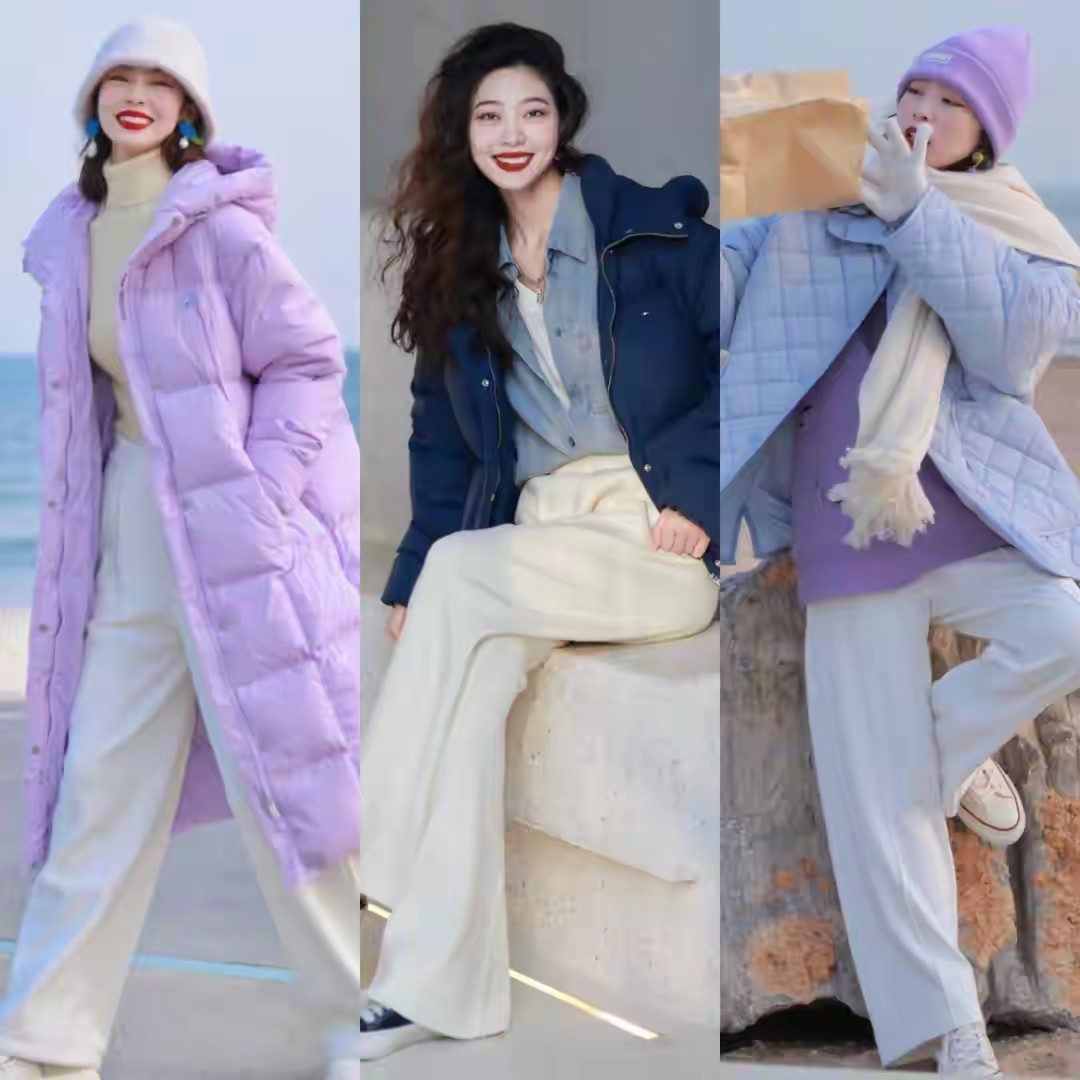 白色的裤子非常的百搭,而且不挑人,不挑年龄,上面这位博主选择了白色的直筒长裤,搭配上紫色羽绒服,藏蓝色羽绒服,雾霾蓝棉衣,选择了彩色系的衣服组合,依然没有任何违和感,出门旅游拍照就会很出片。