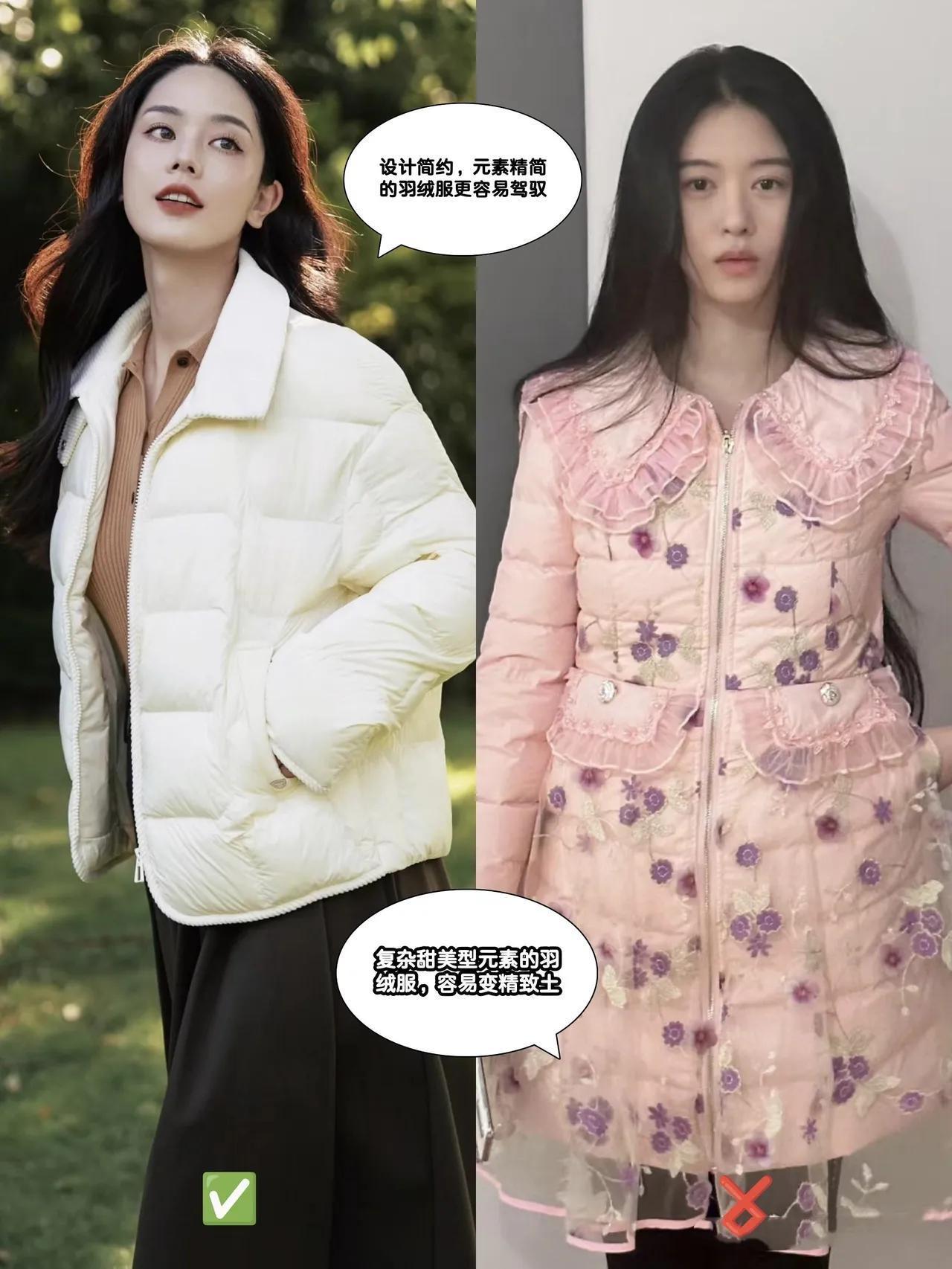 选择复杂甜美型元素的羽绒服,很容易变得精致土,就算是年轻貌美的少女或者是女明星来穿,也驾驭不住。