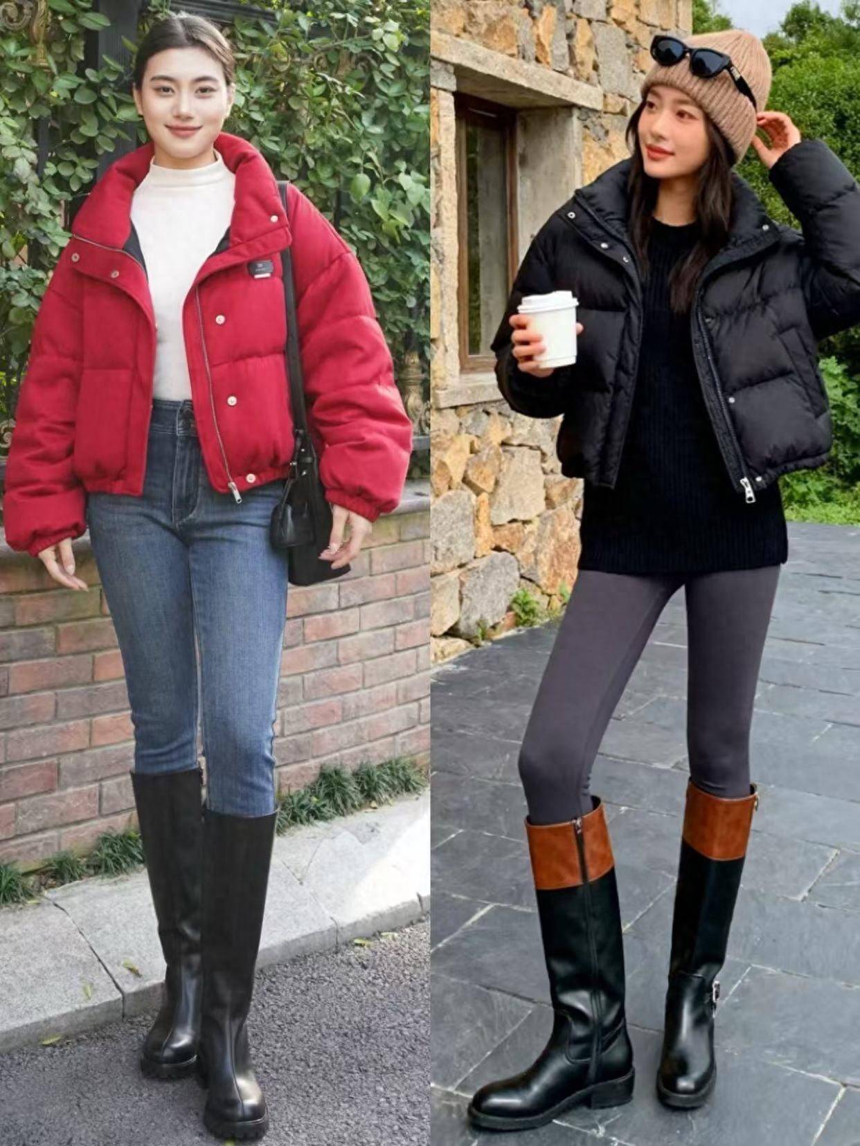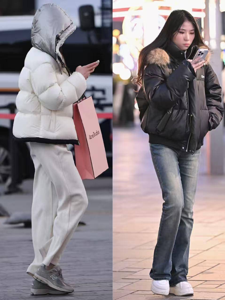例如上面这两位街拍达人,用一件红色的羽绒服搭配上修身款的牛仔裤,脚穿黑色中筒靴,就能很好的呈现出凹凸有致的身材。