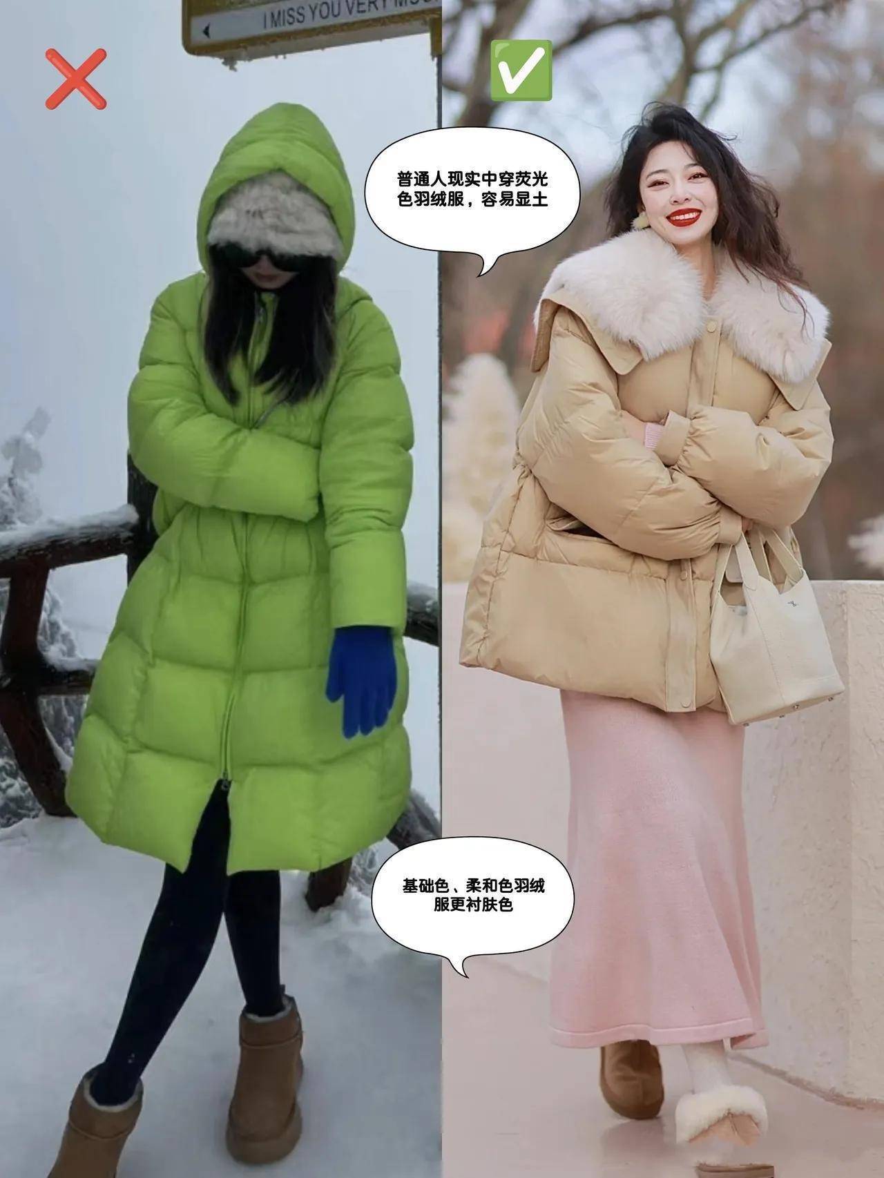 有的时候想要把造型穿的比较有品质,我们一定要避开“荧光色”的羽绒服,这种羽绒服虽然没有花哨的款式,那么的土气,但也缺少了那种精致感和高贵感。
