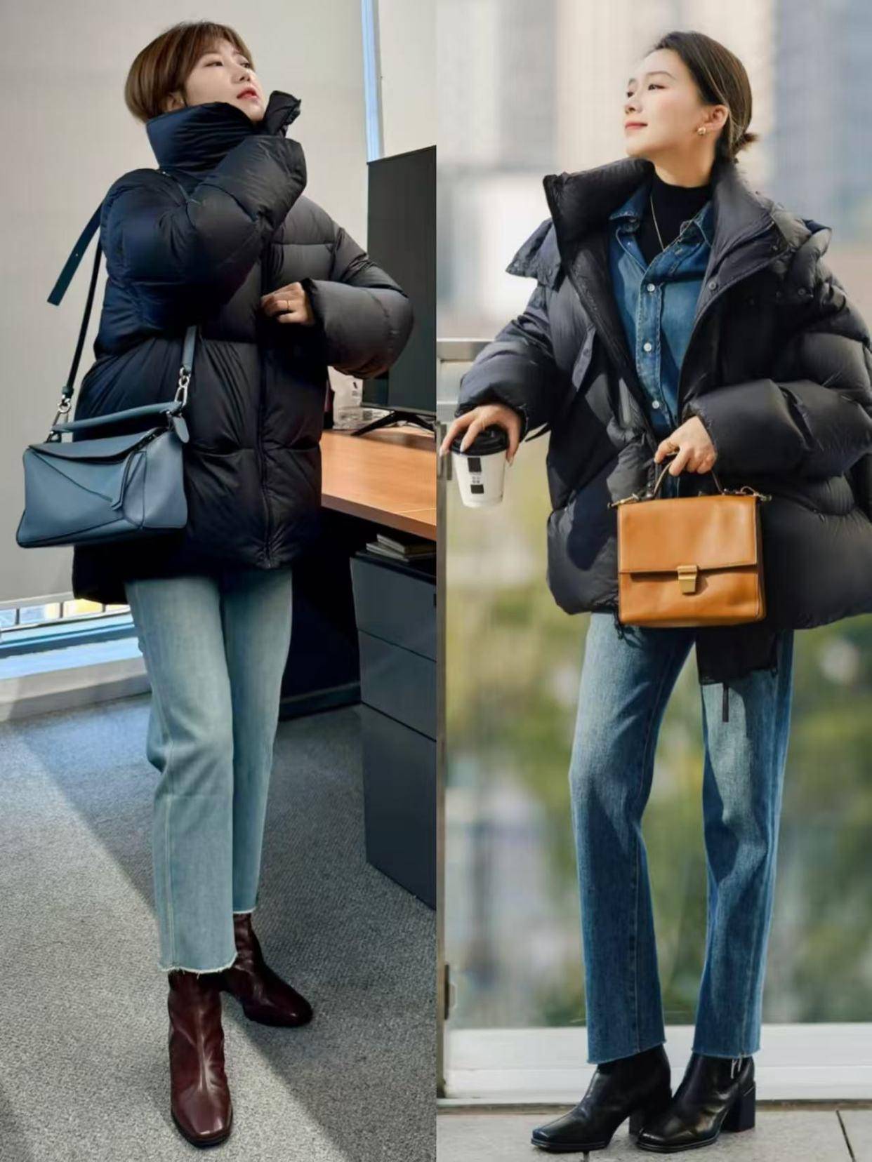 当然,身材不同,选择的穿衣风格也有一定的区别,或者我们还可以根据场合来选择适合自己的穿衣风格,比如上面用短款的黑色羽绒服搭配牛仔直筒长裤,这样“上短下长”的搭配,使得穿搭者身材形成三七分比例。